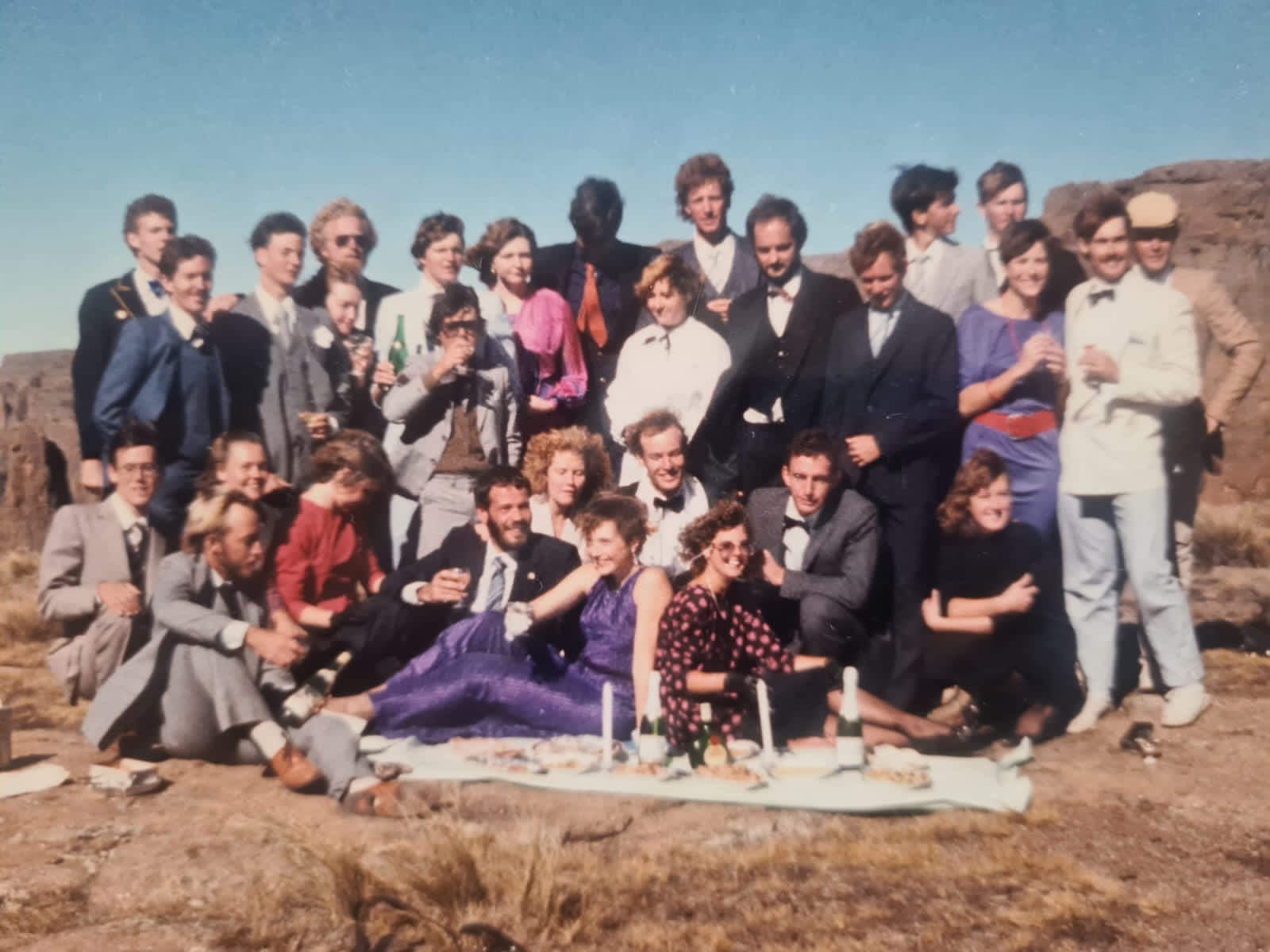 This photograph was taken during the 1986 gathering of the The Explorers Club on the iconic Amphitheatre in the Drakensberg. Members reached the summit via the famous Drakensberg Chain Ladders, ascending to the escarpment for the occasion.
