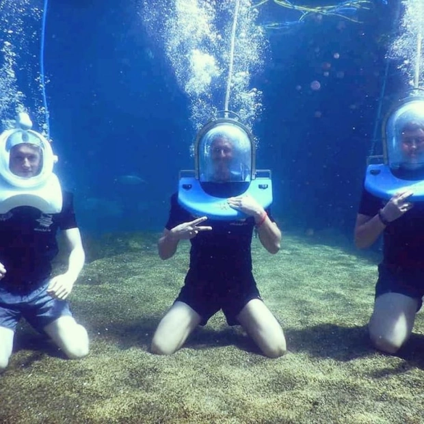 Wearing a specially designed helmet that provides air from the surface, you descend a short ladder onto the sea floor. Once there, you can walk naturally — no swimming required. The helmet keeps your face dry, allows for normal breathing, and gives you a crystal-clear view of the underwater environment around you. It’s like stepping into another world, where shoals of fish dart past and corals sway gently with the current.