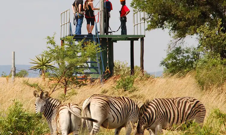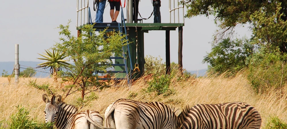 The course features seven steel cable slides suspended at different heights, with the highest reaching 14 metres and a total distance of 1.3 kilometres. Ten take-off and landing platforms allow you to pause, take in the panoramic bushveld scenery, and enjoy refreshments from the highest platform while spectators cheer you on. Along the way, you may spot zebra, blesbok, and even warthog, adding a touch of safari to your zipline adventure.