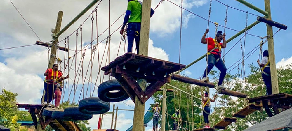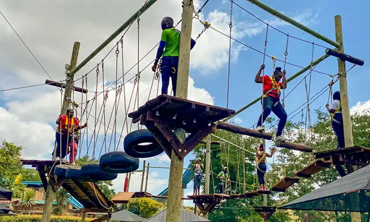 Suspended high above the ground, our course features 26 elevated obstacles that will test your balance, courage and determination. Navigate swinging beams, cross suspended bridges, tackle vertical spider nets and conquer a variety of hanging elements — all designed to challenge and delight adventurers of every age and ability. Whether you're a first-timer finding your feet or a seasoned rope course enthusiast, there's something here to push your limits and put a smile on your face.