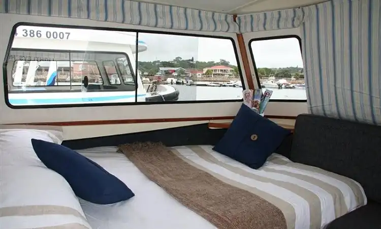 Before departure, enjoy a brief safety briefing and, if needed, a short temporary skipper’s course. Once aboard, load your gear, family, friends, and drinks – you’re ready to start your journey. The boat is fully equipped for comfort, featuring a gas stove and oven, electric fridge, all utensils, pots, cutlery, and a gas geyser for warm showers. The Tranquillity sleeps up to five, with space for seven on day trips. A small Weber braai is also provided for those classic riverside cookouts.