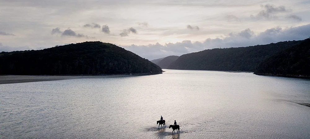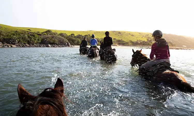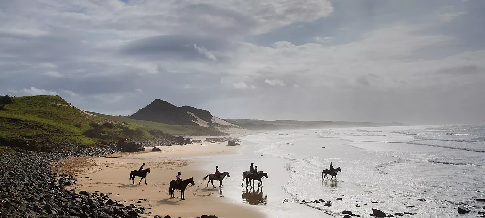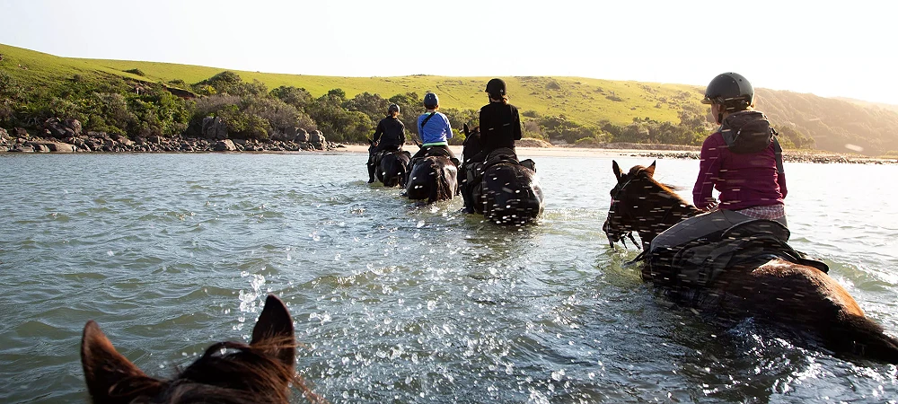 Horse safaris, horse riding and beach rides operator on the Wild Coast of South Africa. Escape with Wild Coast Horse Riding Adventures - Horse riding on the edge of Africa! This horse trail safari is rated one of the top ten equestrian destinations in the world. Discover the rural wilderness of the South African Wild Coast, one sweeping bay after another – rolling hillsides, river crossings and warm lagoons ensure adventure filled days of fabulous riding.