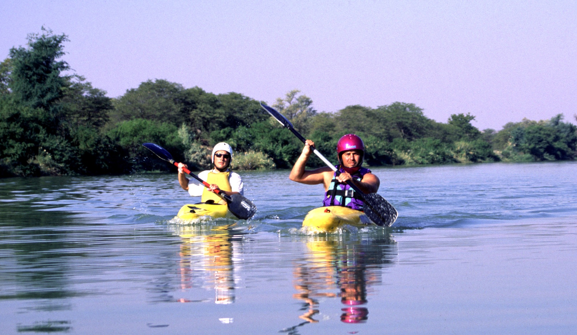 Our rough plan was to travel by river from Ruacana to the sea, an approximately 400km journey supported where possible by 4x4. On departure we hadn’t yet worked out how to return from the inaccessible Kunene Mouth on the Skeleton Coast. Vehicle access was impossible within 50km, so was paddling up or down the coastline to civilisation. Not to be bogged down with details we went anyway. Johan and I were to paddle plastic white-water kayaks and Matthew Pitman, my prospective brother-in-law, was roped in to paddle the supply boat – a 2-man inflatable ARK “Croc” raft. The girl-power crew of Jenny, Anita and Chrizette commandeered the two support vehicles with Graham, the “Jack of All Trades” making up the full team.
