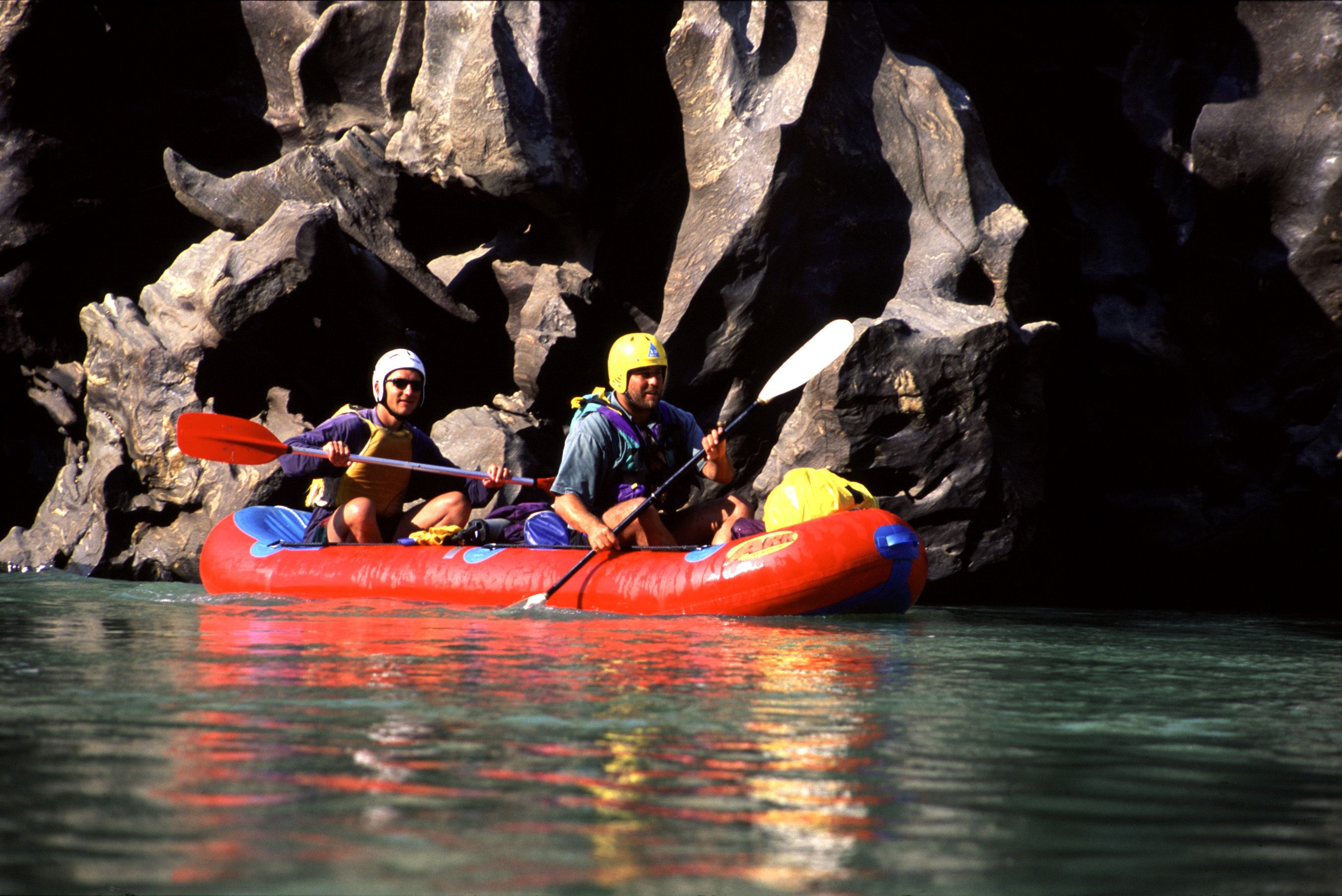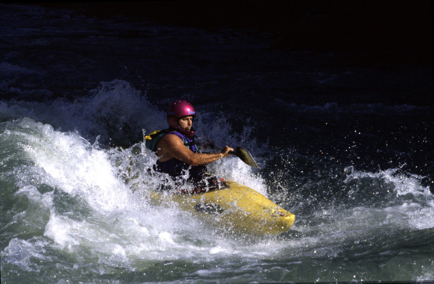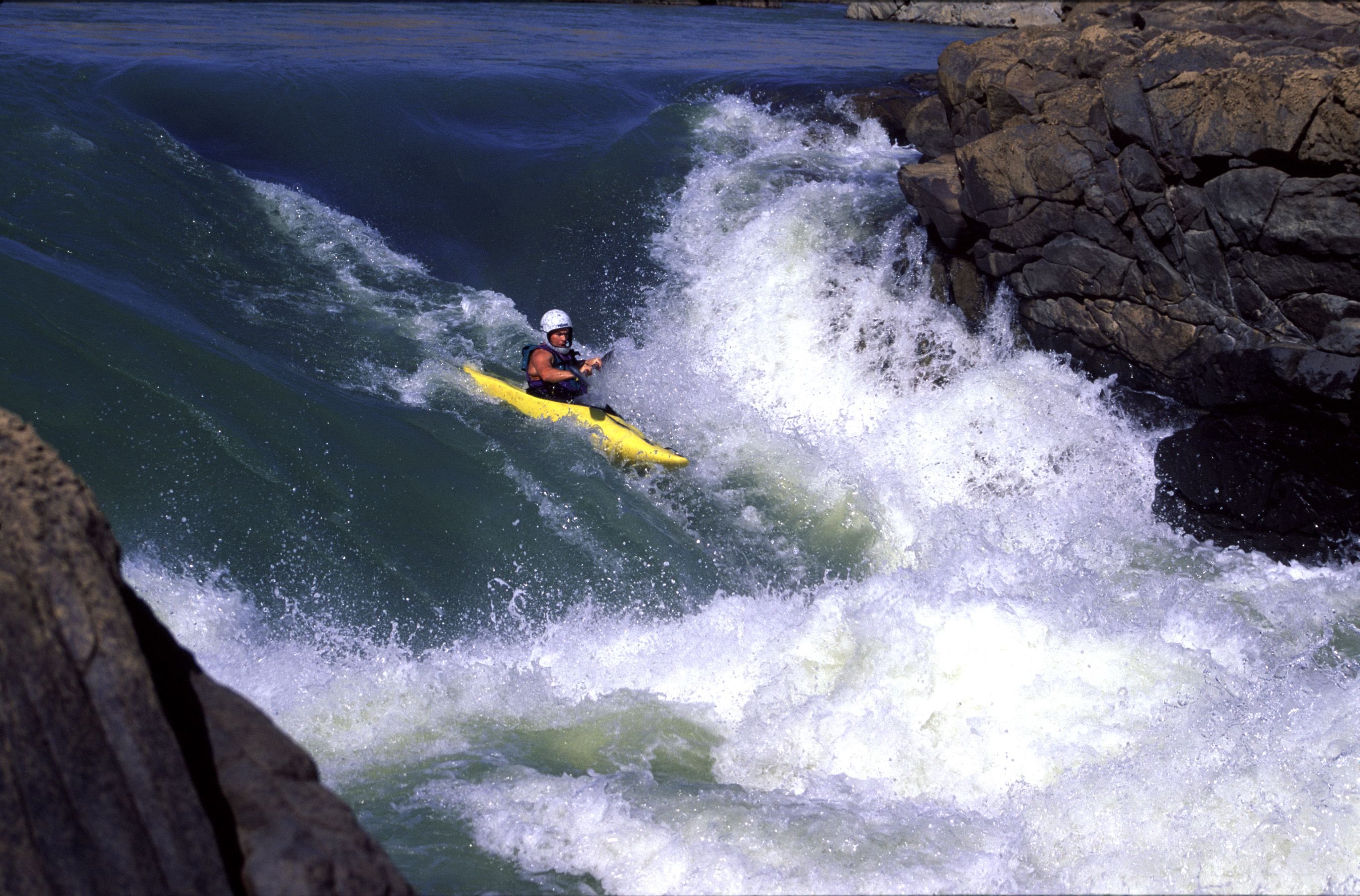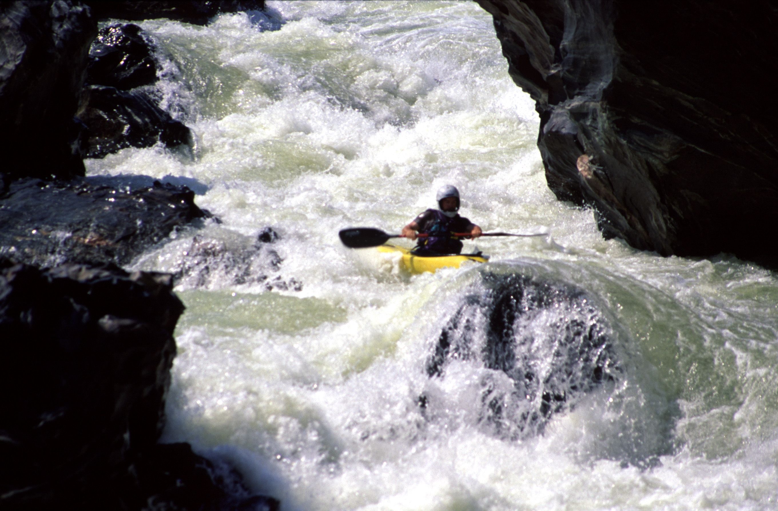 The water started to behave like a pinball in a games machine. It bounced off this wall then that wall, plunging over obstacles and disappearing behind tall boulders. This was not a forgiving river and there was no place to stop. I fought to keep my concentration against images of holding my breath in a submerged watery cavern. I swore loudly at the protruding rocks and boiling foam piles as I passed them. This silly arrogance worked to stay the panic that was freezing my mind and my downstream assault became clinical and precise. Riding the shoulder boils to maximise visibility, using every eddy to slow the descent and surfing right to left with carefully raised rails I fought for survival against the seething water. For 400m the river attempted to break every rule of smooth passage until almost totally disorientated I broke its grip and squeezed into a tiny pothole eddy on the lip of a drop.